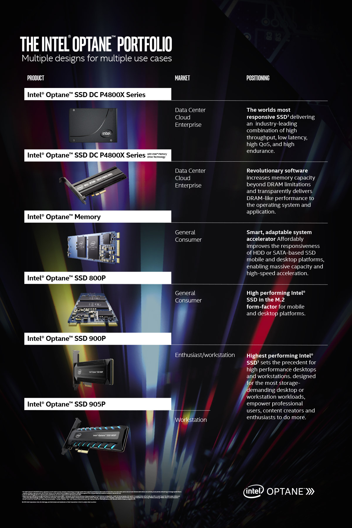 Intel Optane Poster Designed posters for Intel showcasing their family of Optane processors and each product’s market and positioning. Final shown and a few alternate compositions. Client: Intel Services: Art direction, design