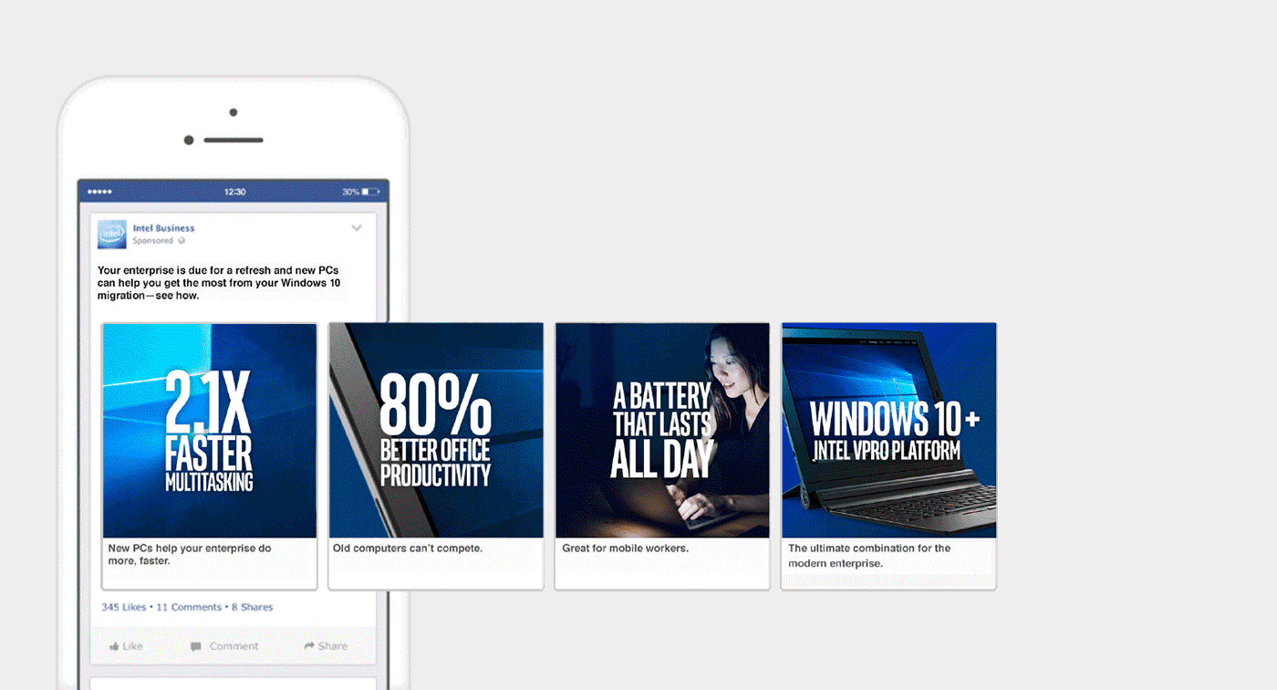 Facebook carousel images Podcast Series LinkedIn Ads Intel SMB Social Promo Ads (Twitter/LinkedIn) Intel Social Posts+ Visuals for all of Intel and/or Intel Business social channels including Facebook, Twitter, and LinkedIn. Carousels, stills, galleries, and videos. Client: Intel Services: Art direction, design Agency: Doremus